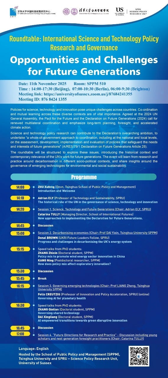 I’ve just come back from a short but very full week in Beijing, where I met curriculum innovators and scholars working on governance and technology, spoke with strategists in the private sector, and compared notes with old friends. It included a fascinating Tsinghua University Roundtable on Future Generations (see the agenda below), jointly held with their long-standing partner, the Science Policy Research Unit at the UK University of Sussex.